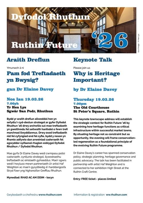 Bydd yr araith dreflun allweddol hon yn sefydlu'r cyd-destun strategol ar gyfer Dyfodol Rhuthun ’26 drwy archwilio sut mae treftadaeth yn gweithredu fel seilwaith hanfodol o fewn trefi marchnad llwyddiannus. Drwy osod treftadaeth nid fel cyfyngiad ond fel cyfle, bydd y noson yn fframio adfywio dan arweiniad cadwraeth fel egwyddor sylfaenol rhaglen esblygol Dyfodol Rhuthun / Dyfodol Rhuthun.