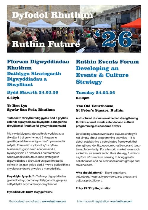 Nid yw datblygu strategaeth digwyddiadau a diwylliant tref yn ymwneud â rhaglennu gweithgareddau yn unig — mae'n ymwneud â sefydlu fframwaith cydlynol sy'n cryfhau hunaniaeth, gwydnwch economaidd a bywiogrwydd lle hirdymor. I dref farchnad hanesyddol fel Rhuthun, mae strategaeth digwyddiadau a diwylliant yn gweithredu fel seilwaith lle, gan geisio dod â mwy o gydweithio a chydlynu ar draws grwpiau a rhanddeiliaid.