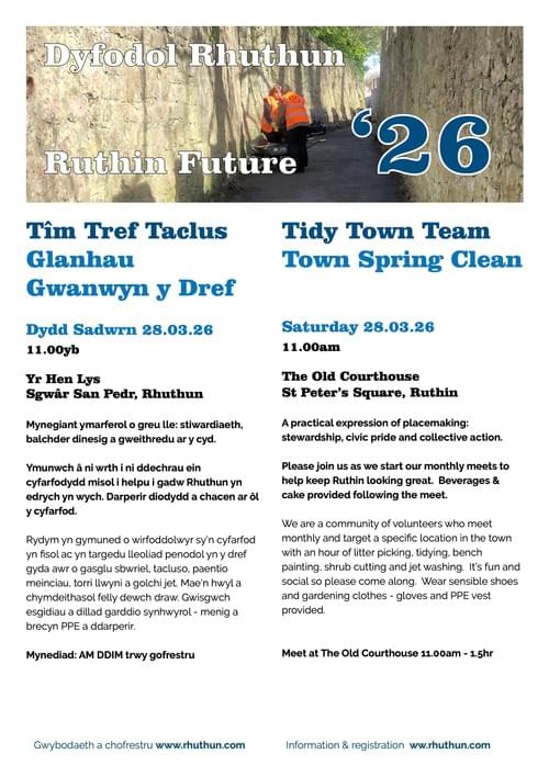 Ymunwch â ni wrth i ni ddechrau ein cyfarfodydd misol i helpu i gadw Rhuthun yn edrych yn wych. Darperir diodydd a chacen ar ôl y cyfarfod.